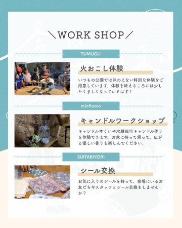 焼き菓子やドーナツ、お弁当などのお店がずらりと並び、青空の下で美味しいグルメを満喫。さらに、火おこし体験やキャンドル作り、シール交換など、子どもと一緒に楽しめるワークショップも充実しています。