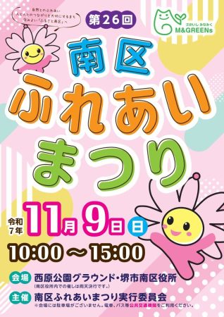 「第26回南区ふれあいまつり」は、栂・美木多駅の近く、西原公園グラウンドと堺市南区役所の2か所で同時開催されます。