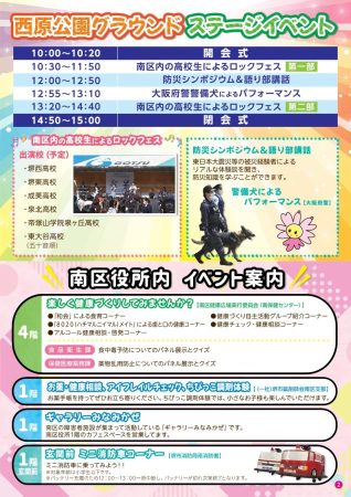 ステージイベントでは、南区内の高校生によるロックフェスや、大阪府警警備犬によるパフォーマンスなどが行われます。
