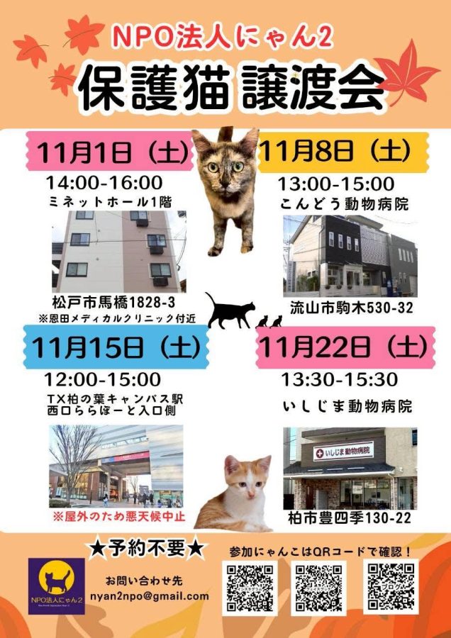 今回は、NPO法人にゃん2さんによる、保護猫譲渡会開催のお知らせです。