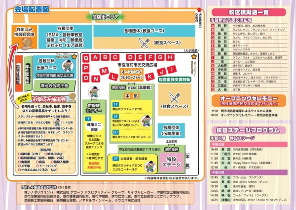 市役所前市民交流広場では、17校区が集まり、から揚げやちらし寿司などのフードブースや写真展示、手作りアクセサリー販売などを行います。