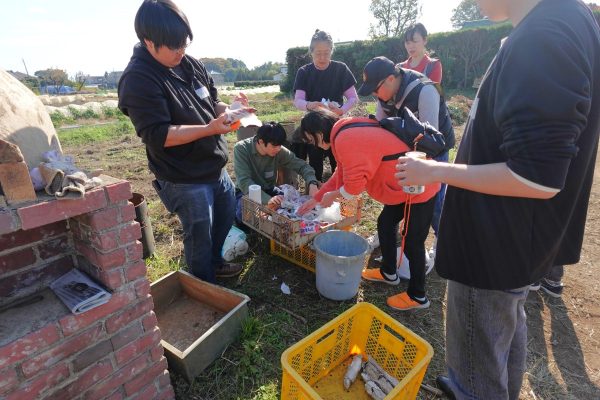 焼き芋を配る子ども、ピザを切り分ける大学生、車椅子の参加者を自然に囲む輪。