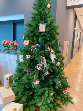 ホールに飾られた大きなツリーにオーナメントをオン!
