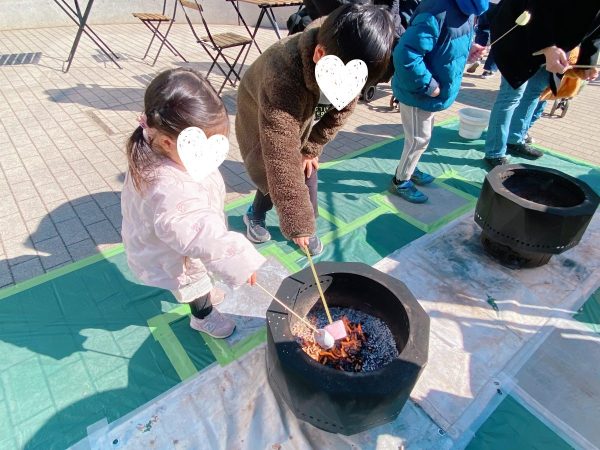 子どもたちは焼きマシュマロに夢中、大人はあったかフードやコーヒーを片手にひと息