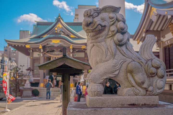 駅前のにぎやかな商業エリアの中に、ふと現れる鳥居が印象的。