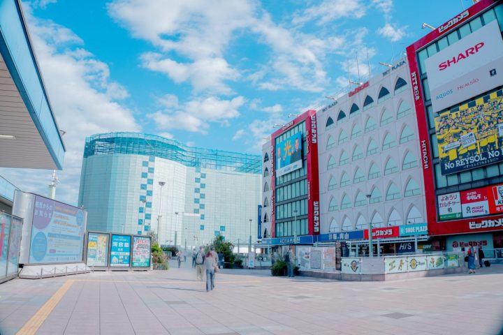 駅前のにぎやかな商業エリアの中に、ふと現れる鳥居が印象的。