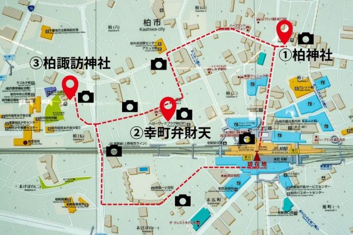 柏駅東口から ①柏神社 ②幸町弁財天 ③柏諏訪神社 と巡り、柏西駅西口に戻ってくるこの参拝コース。