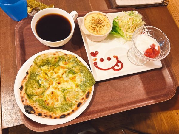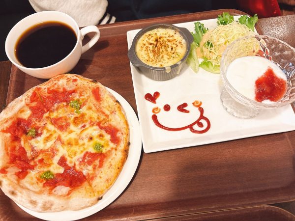 ミニサイズのピザに副菜とデザート、ドリンクも付いた盛沢山のワンプレート。