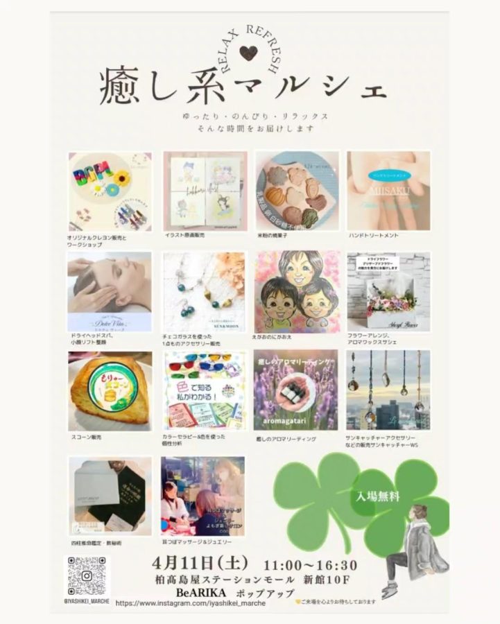 今回は、4月11日(土) 柏市にて開催される「癒し系マルシェ」の情報をお伝えいたします。